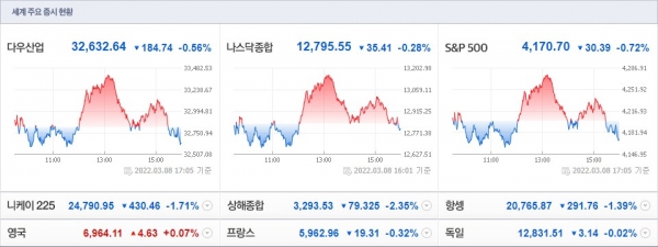 [뉴스웍스=이한익 기자] 뉴욕증시가 미국과 유럽의 러시아산 원유 수입 금지 제재에 유가가 급등하면서 일제히 하락 마감했다.