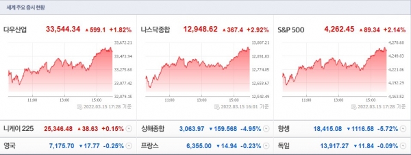 [뉴스웍스=이한익 기자] 뉴욕증시가 2월 미국 생산자물가지수(PPI) 둔화와 국제유가 급락세에 인플레이션 우려가 완화되면서 일제히 상승 마감했다.