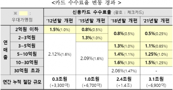 여신금융협회에 따르면 카드사들의 가맹점 수수료 부문 영업이익은 2013~2015년 5000억원에서 2016~2018년 235억원으로 감소했고, 2019~2020년에는 1317억원의 손실을 기록했다. 카드 가맹점 수수료율은 3년 주기로 조정되지만, 정부가 우대수수료율을 적용받는 영세·중소 가맹점 범위를 확대해가면서 사실상 매년 카드수수료를 낮췄기 때문이다.