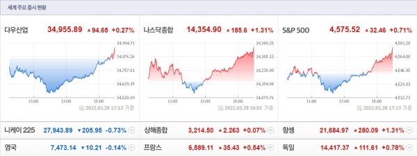 [뉴스웍스=이한익 기자] 뉴욕증시가 러시아와 우크라이나간 갈등 완화 기대감에 일제히 상승 마감했다.