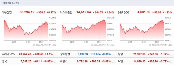 스탠더드앤드푸어스(S&P)500 지수는 전장보다 56.08포인트(1.23%) 상승한 4631.60으로, 기술주 중심의 나스닥 지수는 전장보다 264.74포인트(1.84%) 뛴 1만4619.64로 거래를 끝냈다.