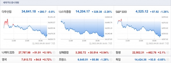 스탠더드앤드푸어스(S&P)500 지수는 전장보다 57.52포인트(1.26%) 하락한 4525.12로, 기술주 중심의 나스닥 지수는 전장보다 328.38포인트(2.26%) 내린 1만4204.17로 거래를 끝냈다.