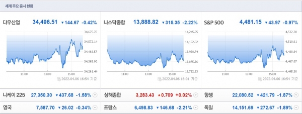 [뉴스웍스=이한익 기자] 뉴욕증시가 3월 연방공개시장위원회(FOMC) 정례회의 의사록을 통해 확인된 연방준비제도(Fed)의 공격적 긴축 부담에 일제히 하락 마감했다.