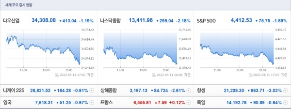 [뉴스웍스=이한익 기자] 뉴욕증시가 일제히 하락 마감했다. 3월 소비자물가지수(CPI) 발표를 하루 앞두고 국채금리가 급등한 영향을 받았다.