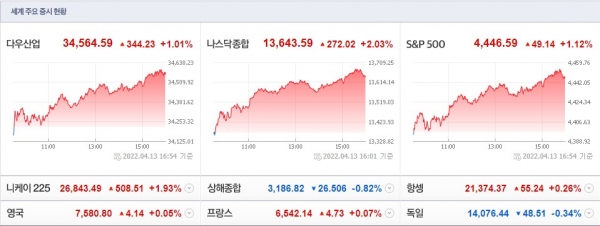 [뉴스웍스=이한익 기자] 뉴욕증시가 미국의 3월 생산자물가(PPI) 상승세 지속에도 불구하고 인플레이션 피크아웃 기대감에 일제히 상승 마감했다.