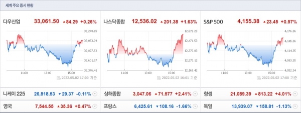 스탠더드앤드푸어스(S&P)500지수는 전장보다 23.45포인트(0.57%) 상승한 4155.38로, 기술주 중심의 나스닥 지수는 전장보다 201.38포인트(1.63%) 뛴 1만2536.02로 거래를 마쳤다.