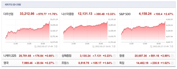 이날 기술주가 큰폭으로 상승했다. 오토데스크는 1분기 예상보다 좋은 실적을 발효한 이후 10.3% 올랐고, 델 테크놀로지스와 말벨도 실적 호조로 각각 12%, 6.7% 상승했다. 대표 기술주인 테슬라는 7.33% 급등했고 엔비디아(+5.38%), 아마존(+3.66%), 애플(+5.86%), 메타(+1.83%) 등도 일제히 올랐다. 뉴욕증시는 오는 30일 미국의 현충일인 '메모리얼 데이' 연휴를 맞아 휴장한다.