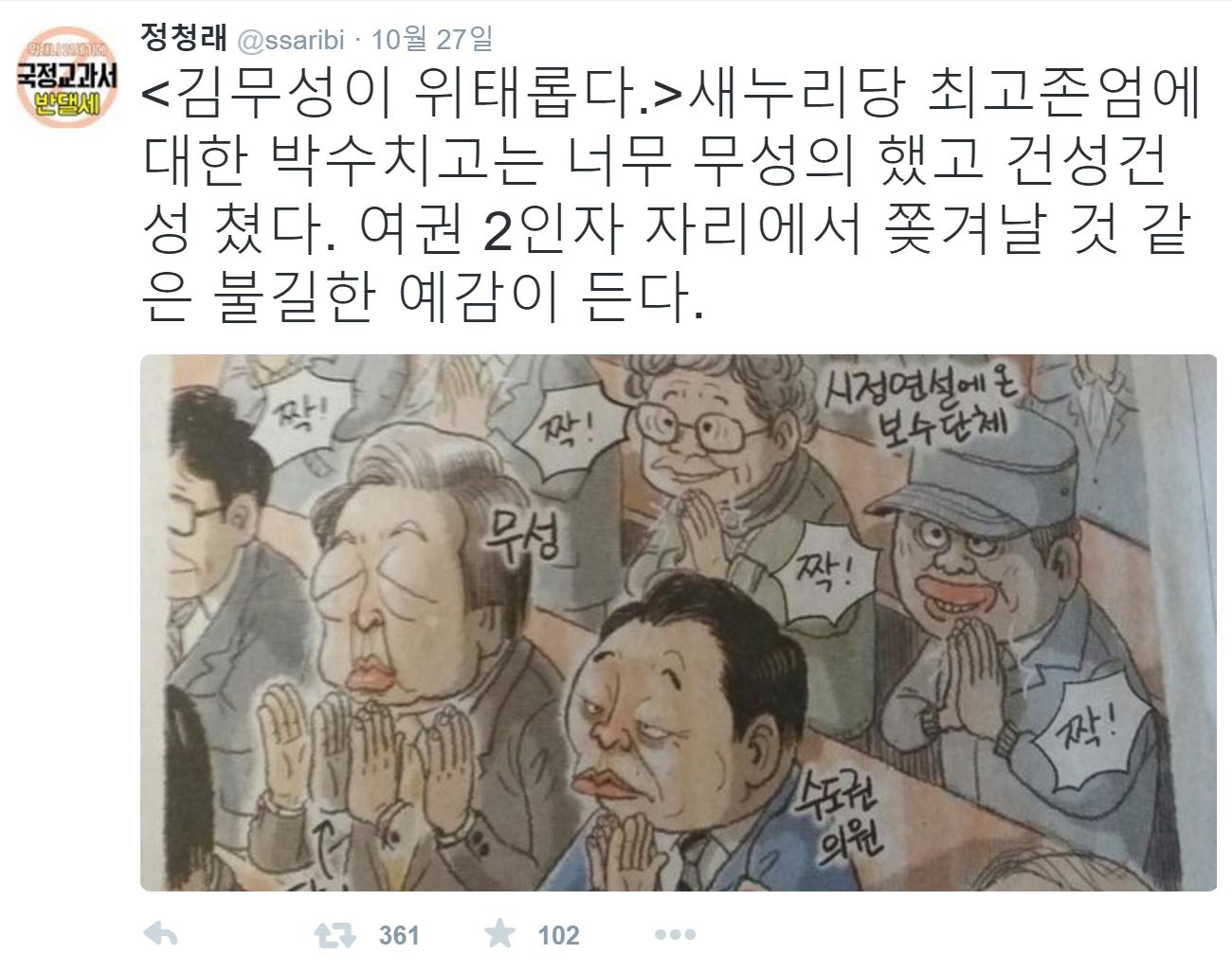 기자명 온라인뉴스팀 입력 2015.10.29 14:20 새정치민주연합 정청래 의원이 본인의 트위터 계정을 통해 "(김무성 대표가) 여권 2인자 자리에서 쫓겨날 것 같은 불길한 예감이 든다"고 써 SNS상에서 화제가 되고 있다. 광고안내 제보 온라인뉴스팀 onlinenews@newsworks.co.kr 기자페이지 [인사] DB자산운용·DB증권·DB캐피탈·DB저축은행[부고] 김대일(신영증권 부사장)씨 모친상[인사] DB손해보험·DB생명 저작권자 © 뉴스웍스 무단전재 및 재배포 금지 개의 댓글 회원로그인 작성자 비밀번호 댓글 내용입력 댓글 정렬 최신순 추천순 답글순 BEST댓글 BEST 댓글 답글과 추천수를 합산하여 자동으로 노출됩니다. 닫기 더보기 댓글삭제 삭제한 댓글은 다시 복구할 수 없습니다. 그래도 삭제하시겠습니까? 비밀번호 닫기 댓글수정 댓글 수정은 작성 후 1분내에만 가능합니다. 본문 / 400 비밀번호 닫기 내 댓글 모음 닫기