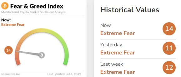암호화폐 데이터 제공 업체 얼터너티브의 '공포·탐욕 지수'는 전날보다 3포인트 상승한 '14'로 나타났다. 해당 지수는 '0'에 가까울수록 시장의 극단적 공포를 나타내며 '100'에 가까울수록 극단적 낙관을 의미한다.