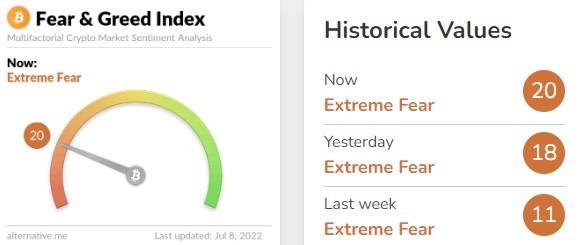 암호화폐 데이터 제공 업체 얼터너티브의 '공포·탐욕 지수'는 '20'으로 상승했다. 전날보다 2포인트, 지난주보다는 9포인트 상승한 수치다. 해당 지수는 '0'에 가까울수록 시장의 극단적 공포를 나타내며 '100'에 가까울수록 극단적 낙관을 의미한다. 한 주 전 11에 머물렀던 '공포·탐욕 지수'가 두 배 가까이 상승한 것은 암호화폐 하락에 대한 우려가 상당부분 완화했다는 것을 의미하고 있다.