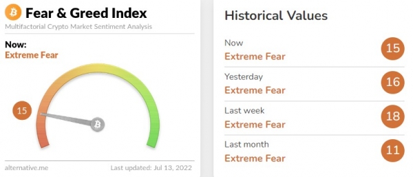 암호화폐 데이터 제공 업체 얼터너티브의 '공포·탐욕 지수'는 전날보다 1포인트 하락한 '15(극단적 공포)'로 나타났다. 해당 지수는 '0'에 가까울수록 시장의 극단적 공포를 나타내며 '100'에 가까울수록 극단적 낙관을 의미한다.