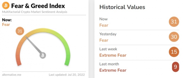 암호화폐 데이터 제공 업체 얼터너티브의 '공포·탐욕 지수'는 전날보다 1포인트 상승한 '31'(공포)로 나타났다. 해당 지수는 '0'에 가까울수록 시장의 극단적 공포를 나타내며 '100'에 가까울수록 극단적 낙관을 의미한다. 한달 전 '9', 일주일 전 '15'를 기록했던 것과 비교할 때, 이전보다 낙관적인 흐름을 타고 있는 것으로 해석된다.