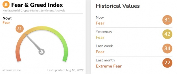 암호화폐 데이터 제공 업체 얼터너티브의 '공포·탐욕 지수'는 전날보다 11포인트 급락한 '31'(공포)로 나타났다. 해당 지수는 '0'에 가까울수록 시장의 극단적 공포를 나타내며 '100'에 가까울수록 극단적 낙관을 의미한다.
