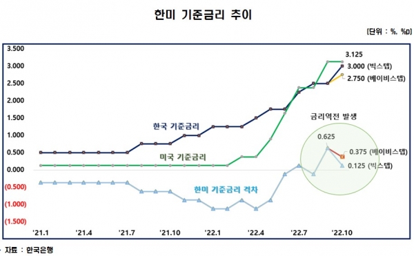 한경연은 한국은행 금융통화위원회가 오는 10월 베이비스텝(0.25%p 인상)이나 빅스텝(0.5%p 인상)을 하더라도 한·미 간 기준금리 격차는 ▲빅스탭 시 0.125%포인트 ▲베이비스텝 시 0.375%포인트를 기록할 것으로 전망돼 기준금리 역전현상은 당분간 지속될 것으로 관측했다.