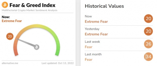 암호화폐 데이터 제공 업체 얼터너티브의 '공포·탐욕 지수'는 전날과 같은 '20'(극심한 공포)로 나타났다. 해당 지수는 '0'에 가까울수록 시장의 극단적 공포를 나타내며 '100'에 가까울수록 극단적 낙관을 의미한다. 지난주 '26'(공포)보다는 6포인트 하락했다.