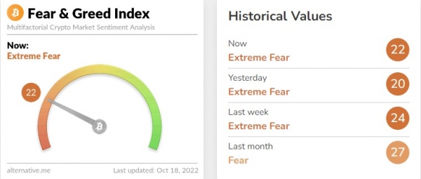 암호화폐 데이터 제공 업체 얼터너티브의 '공포·탐욕 지수'는 전날 '20'(극심한 공포)보다 2포인트 개선된 '22'(극심한 공포)로 나타났다. 해당 지수는 '0'에 가까울수록 시장의 극단적 공포를 나타내며 '100'에 가까울수록 극단적 낙관을 의미한다. 지난주 '27'(공포)보다는 5포인트 하락했다.