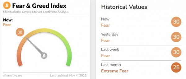 투자심리 지표는 비슷한 수준을 유지하고 있다. 암호화폐 데이터 제공 업체 얼터너티브의 '공포·탐욕 지수'는 전날과 같은 '30'(공포)로 나타났다. 해당 지수는 '0'에 가까울수록 시장의 극단적 공포를 나타내며 '100'에 가까울수록 극단적 낙관을 의미한다.
