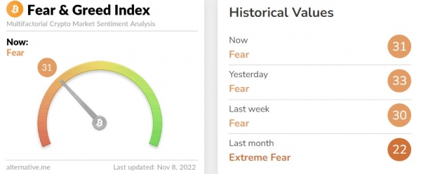투자심리 지표도 전날보다 소폭 악화됐다. 암호화폐 데이터 제공 업체 얼터너티브의 '공포·탐욕 지수'는 전날 '33'(공포)보다 2포인트 하락한 '31'(공포)로 나타났다. 해당 지수는 '0'에 가까울수록 시장의 극단적 공포를 나타내며 '100'에 가까울수록 극단적 낙관을 의미한다. 다만 지난주 '22'(극심한 공포)보다는 개선된 수준이다.