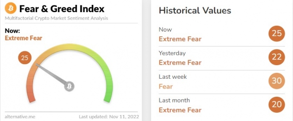 투자심리 지표는 소폭 개선됐다. 암호화폐 데이터 제공 업체 얼터너티브의 '공포·탐욕 지수'는 전날 '22'(극심한 공포)보다 3포인트 오른 '25'(극심한 공포)로 나타났다. 해당 지수는 '0'에 가까울수록 시장의 극단적 공포를 나타내며 '100'에 가까울수록 극단적 낙관을 의미한다. 지난주 '30'(공포)보다는 하락한 수준을 유지하고 있다.