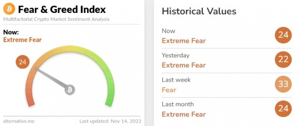 투자심리 지표는 소폭 개선됐다. 암호화폐 데이터 제공 업체 얼터너티브의 '공포·탐욕 지수'는 전날 '22'(극심한 공포)보다 2포인트 오른 '24'(극심한 공포)로 나타났다. 해당 지수는 '0'에 가까울수록 시장의 극단적 공포를 나타내며 '100'에 가까울수록 극단적 낙관을 의미한다. 지난주 '33'(공포)보다는 8포인트 악화된 수준이다.