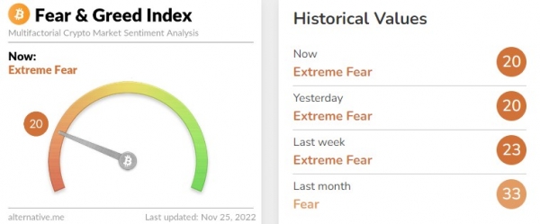 암호화폐 데이터 제공 업체 얼터너티브의 '공포·탐욕 지수'는 전날과 같은 '20'(극심한 공포)로 나타났다. 해당 지수는 '0'에 가까울수록 시장의 극단적 공포를 나타내며 '100'에 가까울수록 극단적 낙관을 의미한다. 지난주 '23'(극심한 공포)에 비해 소폭 악화됐다.