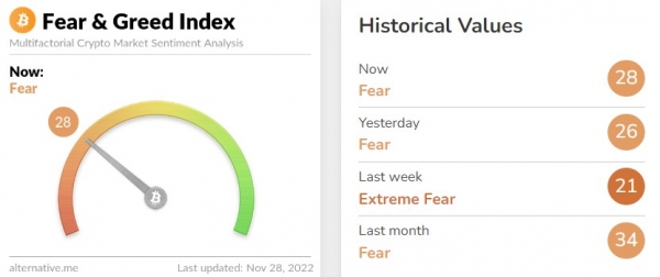 암호화폐 데이터 제공 업체 얼터너티브의 '공포·탐욕 지수'는 전날 '26'(공포)보다 2포인트 개선된 '28'(공포) 단계를 나타내고 있다. 해당 지수는 '0'에 가까울수록 시장의 극단적 공포를 나타내며 '100'에 가까울수록 극단적 낙관을 의미한다. 지난주 '21'(극심한 공포)에 비해 7포인트 올랐다.