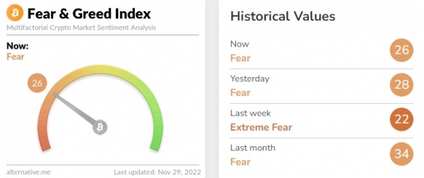 암호화폐 데이터 제공 업체 얼터너티브의 '공포·탐욕 지수'는 전날 '28'(공포)보다 2포인트 내린 '26'(공포) 단계를 나타내고 있다. 해당 지수는 '0'에 가까울수록 시장의 극단적 공포를 나타내며 '100'에 가까울수록 극단적 낙관을 의미한다. 지난주 '22'(극심한 공포)보다는 4포인트 개선된 수준이다.