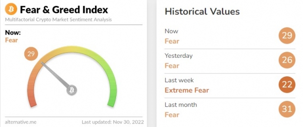암호화폐 데이터 제공 업체 얼터너티브의 '공포·탐욕 지수'는 전날 '26'(공포)보다 3포인트 오른 '29'(공포) 단계를 나타내고 있다. 해당 지수는 '0'에 가까울수록 시장의 극단적 공포를 나타내며 '100'에 가까울수록 극단적 낙관을 의미한다. 지난주 '22'(극심한 공포)보다는 7포인트 개선된 수준이다.