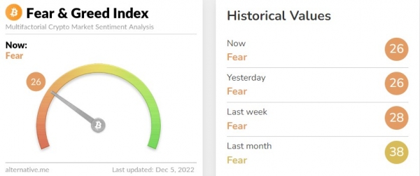 암호화폐 데이터 제공 업체 얼터너티브의 '공포·탐욕 지수'는 전날과 같은 '26'(공포) 단계를 나타내고 있다. 해당 지수는 '0'에 가까울수록 시장의 극단적 공포를 나타내며 '100'에 가까울수록 극단적 낙관을 의미한다. 지난주 '28'(공포)보다는 소폭 떨어진 수준이다.
