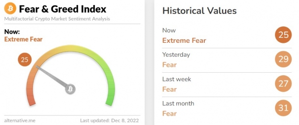 투자심리 지수는 하락했다. 암호화폐 데이터 제공 업체 얼터너티브의 '공포·탐욕 지수'는 전날'29'(공포)보다 4포인트 떨어진 '25'(극심한 공포) 단계를 나타내고 있다. 해당 지수는 '0'에 가까울수록 시장의 극단적 공포를 나타내며 '100'에 가까울수록 극단적 낙관을 의미한다. 지난주 '27'(공포)보다도 2포인트 내렸다.