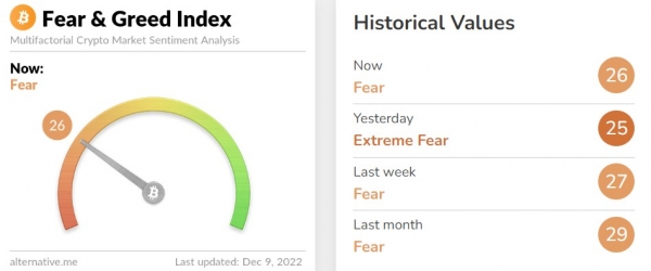 암호화폐 데이터 제공 업체 얼터너티브의 '공포·탐욕 지수'는 전날 '25'(극심한 공포)보다 1포인트 오른 '26'(공포) 단계를 나타내고 있다. 해당 지수는 '0'에 가까울수록 시장의 극단적 공포를 나타내며 '100'에 가까울수록 극단적 낙관을 의미한다. 지난주 '27'(공포)보다 1포인트 하락했다.