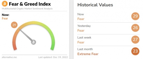 투자심리 지수는 소폭 개선됐다. 암호화폐 데이터 제공 업체 얼터너티브의 '공포·탐욕 지수'는 전날 '26'(공포)보다 3포인트 오른 '29'(공포) 단계를 나타내고 있다. 해당 지수는 '0'에 가까울수록 시장의 극단적 공포를 나타내며 '100'에 가까울수록 극단적 낙관을 의미한다. 지난주 '25'(공포)보다는 6포인트 상승했다.