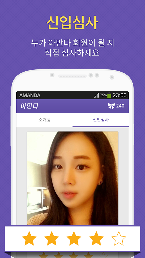 우선 아만다를 내려 받아 회원가입을 신청한 뒤 학력·나이·직업 등 세부항목과 프로필 사진을 올린다. 그러면 회원 30명이 선착순으로 프로필을 보고 별점을 매긴다. 5점 만점 중 3점이 넘어야만 정식가입할 수 있다. 만약 점수미달인 경우에도 재도전을 할 수 있긴 하지만 그마저도 최대 5번까지다.
