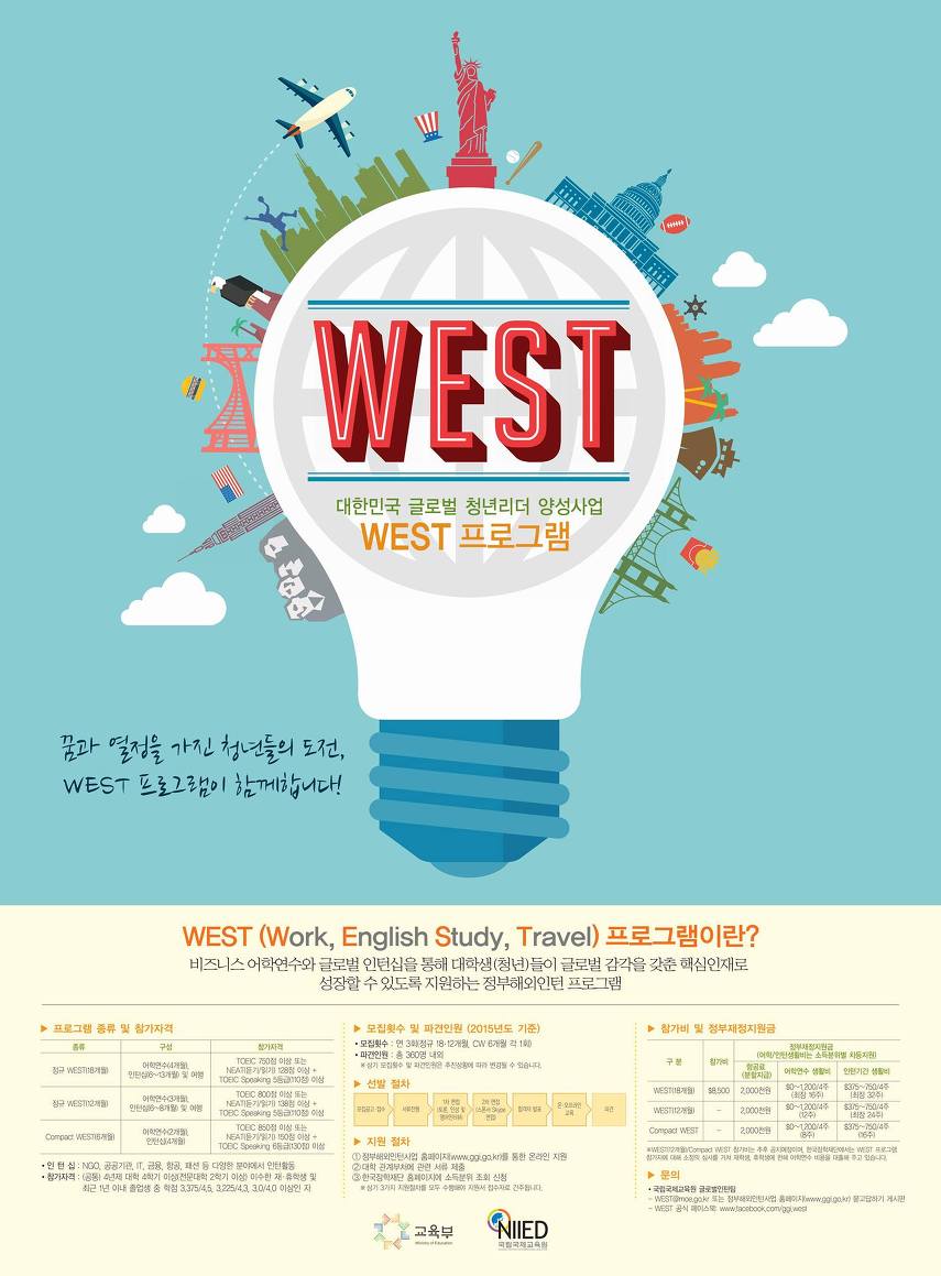 교육부와 국립국제교육원이 주관하는 한미연수프로그램 'WEST'도 있다. Work, English, Study, Travel의 약자인 WEST는 6·12·18개월 과정으로 나눠져 있다. 말 그대로 지원한 기간에 따라 일하면서 영어도 배우고 여행도 할 수 있는 프로그램이다
