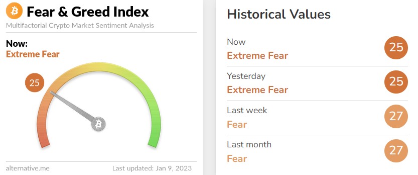 암호화폐 데이터 제공 업체 얼터너티브의 '공포·탐욕 지수'는 전날과 같은 '25'(극심한 공포) 단계를 나타내고 있다. 해당 지수는 '0'에 가까울수록 시장의 극단적 공포를 나타내며 '100'에 가까울수록 극단적 낙관을 의미한다. 지난주 '27'(공포)보다는 2포인트 내린 수준이다.
