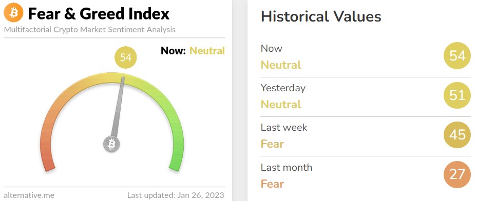 투자심리 지표는 소폭 개선됐다. 암호화폐 데이터 제공 업체 얼터너티브의 '공포·탐욕 지수'는 전날 '51'(중립)보다 3포인트 오른 '54'(중립) 단계를 나타내고 있다. 해당 지수는 '0'에 가까울수록 시장의 극단적 공포를 나타내며 '100'에 가까울수록 극단적 낙관을 의미한다. 지난주 '45'(공포)보다는 9포인트 오른 수준이다.