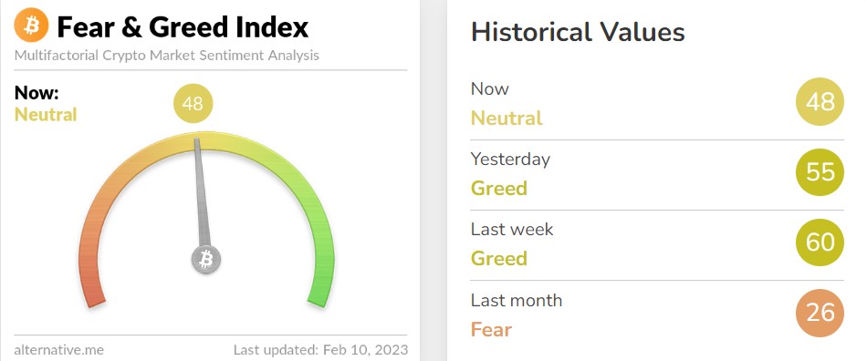 암호화폐 데이터 제공 업체 얼터너티브의 '공포·탐욕 지수'는 전날 '55'(탐욕)보다 7포인트 하락한 '48'(중립) 단계를 나타내고 있다. 해당 지수는 '0'에 가까울수록 시장의 극단적 공포를 나타내며 '100'에 가까울수록 극단적 낙관을 의미한다. 지난주 '60'(탐욕)보다도 12포인트 내렸다.