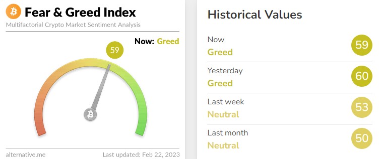 암호화폐 데이터 제공 업체 얼터너티브의 '공포·탐욕 지수'는 전날 '60'(탐욕)보다 1포인트 내린 '59'(탐욕) 단계를 나타내고 있다. 해당 지수는 '0'에 가까울수록 시장의 극단적 공포를 나타내며 '100'에 가까울수록 극단적 낙관을 의미한다. 지난주 '50'(중립)보다는 9포인트 오른 수준이다.