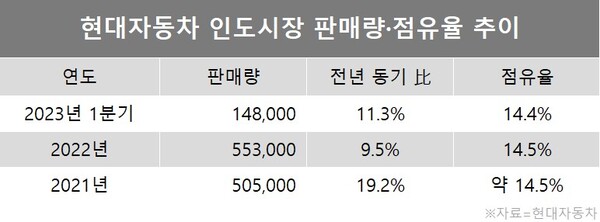 테슬라가 인도 시장 진출에 고배를 마시는 사이, 현지에 생산 공장을 보유한 현대차는 전기차 시장 공략을 토대로 판매량을 지속 늘려나가고 있다.