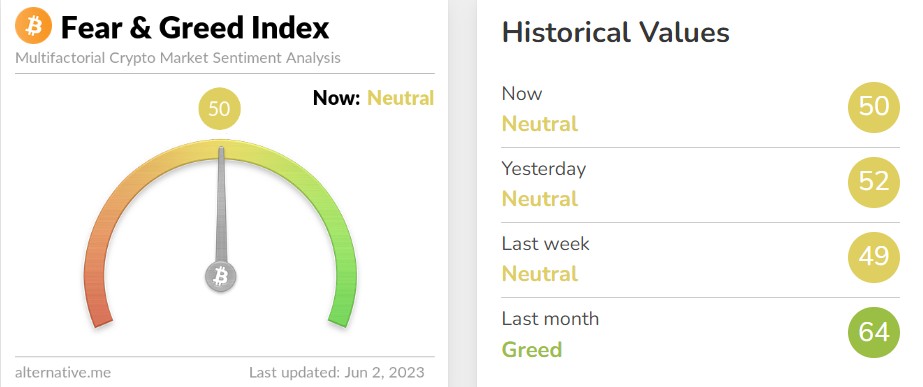 암호화폐 데이터 제공 업체 얼터너티브의 '공포·탐욕 지수'는 전날 '52'(중립)보다 2포인트 내린 '50'(중립) 단계를 나타내고 있다. 해당 지수는 '0'에 가까울수록 시장의 극단적 공포를 나타내며 '100'에 가까울수록 극단적 낙관을 의미한다. 지난주 '49'(중립)보다는 1포인트 오른 수준이다.