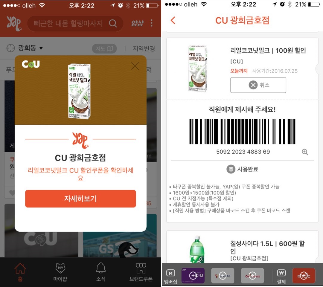 25일 2시20분께 회사 근처 편의점에 들어서니 스마트폰에서 알람이 뜬다. 마침 뭘 마실지 몰라 고민하던 차였다. 팝업 창을 누르자 편의점 제품들과 할인 정보가 줄줄이 나온다. 코코넛음료를 터치해 화면에 뜬 바코드를 계산대 직원이 리더기로 읽으니 100원이 할인된다.