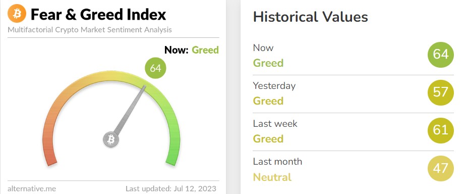 7포인트 오른 '64'(탐욕) 단계를 나타내고 있다. 해당 지수는 '0'에 가까울수록 시장의 극단적 공포를 나타내며 '100'에 가까울수록 극단적 낙관을 의미한다. 지난주 '61'(탐욕)보다는 3포인트 하락한 수준이다.