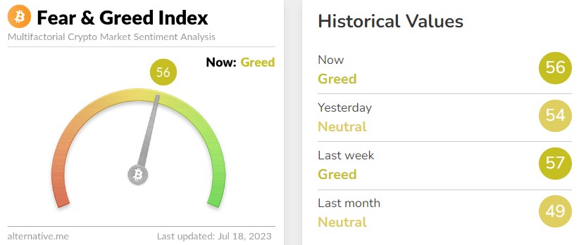 암호화폐 데이터 제공 업체 얼터너티브의 '공포·탐욕 지수'는 전날 '54'(중립)보다 2포인트 오른 '56'(중립) 단계를 나타내고 있다. 해당 지수는 '0'에 가까울수록 시장의 극단적 공포를 나타내며 '100'에 가까울수록 극단적 낙관을 의미한다. 지난주 '57'(탐욕)보다 1포인트 하락한 수준이다.