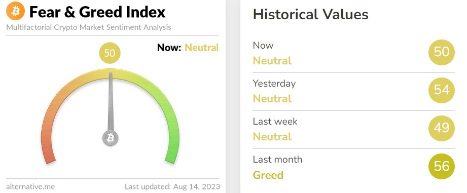 암호화폐 데이터 제공 업체 얼터너티브의 '공포·탐욕 지수'는 전날 '54'(중립)보다 4포인트 내린 '50'(중립) 단계를 나타내고 있다. 해당 지수는 '0'에 가까울수록 시장의 극단적 공포를 나타내며 '100'에 가까울수록 극단적 낙관을 의미한다. 지난주 '49'(중립)보다 1포인트 개선된 수준이다.
