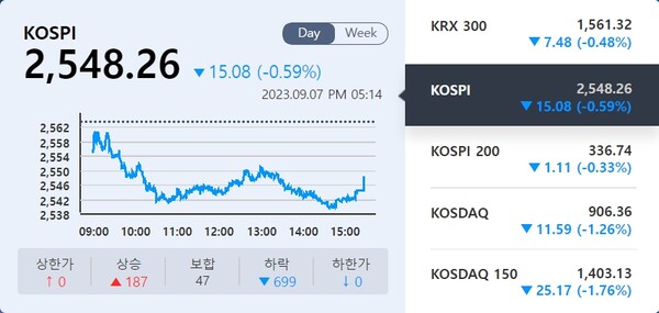 7일 코스피는 전 거래일 대비 0.59% 떨어진 2548.26 포인트로 거래를 마쳤다. 이날도 외국인과 기관투자자의 매도 공세가 이어졌다. 외국인 순매도 규모는 50억원으로 줄었지만 기관투자자는 2757억원의 순매도를 기록했다.