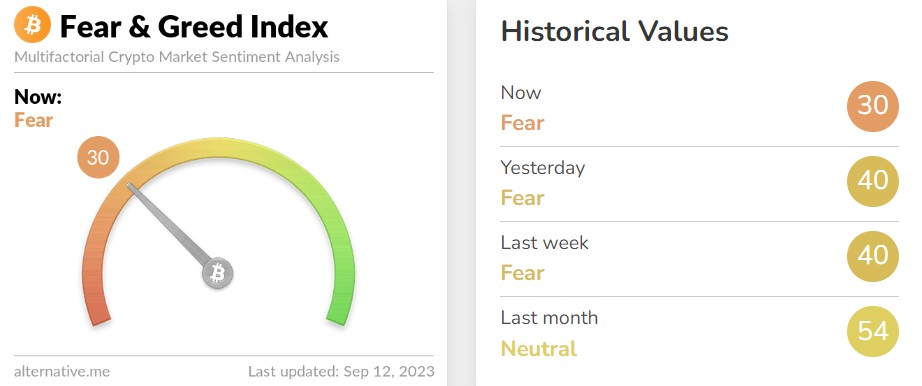 암호화폐 데이터 제공 업체 얼터너티브의 '공포·탐욕 지수'는 전날 '40'(공포)보다 10포인트 떨어진 '30'(공포) 단계를 나타내고 있다. 해당 지수는 '0'에 가까울수록 시장의 극단적 공포를 나타내며 '100'에 가까울수록 극단적 낙관을 의미한다. 지난주 '40'(공포)보다도 10포인트 내린 수준이다.
