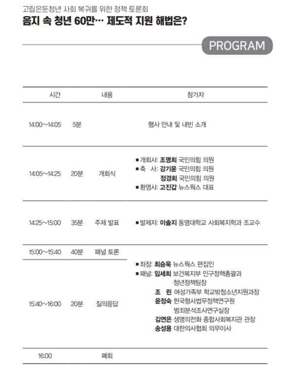 정부와 학계, 의료계, 현장 전문가들이 머리를 맞대어 우리 사회의 건전한 방향성을 제시하는 '고립은둔 청년 사회 복귀를 위한 정책 토론회'에 많은 참여와 관심을 부탁드립니다.