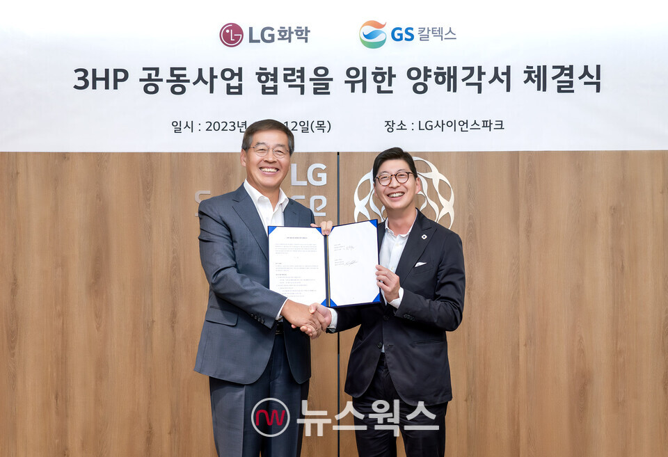 양사는 지난 12일 LG화학 마곡 연구개발(R&D) 캠퍼스에서 생분해성 플라스틱 등 친환경 소재의 핵심 원료인 3HP(3-하이드록시프로피온산) 공동사업 협력을 위한 양해각서(MOU)를 체결했다고 13일 밝혔다. 협약식에는 신학철 LG화학 부회장, 허세홍 GS칼텍스 사장 등이 참석했다.