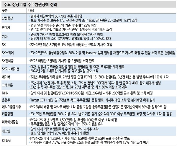 이익 체력과 자본력이 충분한 대기업과 금융권을 중심으로 중장기 주주환원율 목표 및 방법론 등이 제시되고 있다. 주목할 점은 주도주로 지목된 기업들은 단순 저PBR 상황이 아닌 명확한 자본정책 공유를 목표로 뒀다는 것이다.