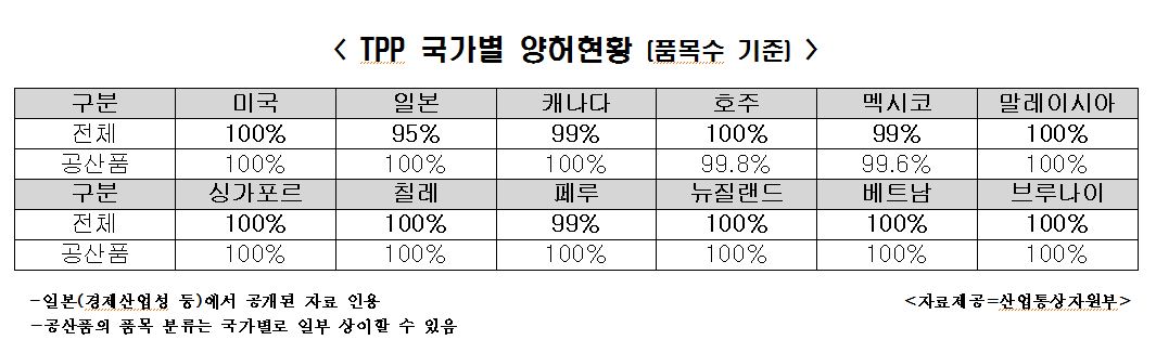 다만 공산품은 10개국이 장·단기간 100% 관세를 철폐키로 했으며, 호주(99.8%)와 멕시코(99.6%)만 일부 품목 예외를 인정받았다.